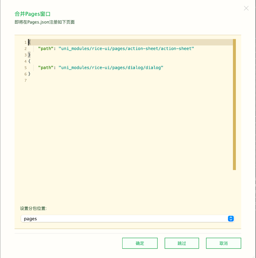 在APP 和 h5 端 如果 需要使用 showDialog 和 showActionSheet 这两个 API,就需要注册这两个页面,当然也可以选择跳过,不注册这两个页面也就是不能使这两个API,其他的功能不受影响。
